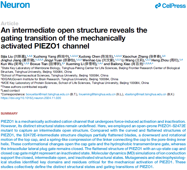 2024年12月23日,清华大学药学院肖百龙教授课题组、生命学院李雪明研究员课题组与药学院田博学研究员课题组合作,在神经科学领域权威期刊《神经元》(Neuron)杂志在线发表了题为《中间开放态结构揭示机械激活PIEZO1 通道的门控转换》(An intermediate open structure reveals the gating transition of the mechanically activated PIEZO1 channel)的研究长文,解析了机械力受体PIEZO1的中间开放状态的结构,揭示了其精细结构动态变化和门控转换过程,并结合结构分析、分子动力学模拟和电生理实验,定义了其关闭态、开放态和失活态的不同构象状态,提出了其门控循环机制,完善了其曲率感知理论学说。
