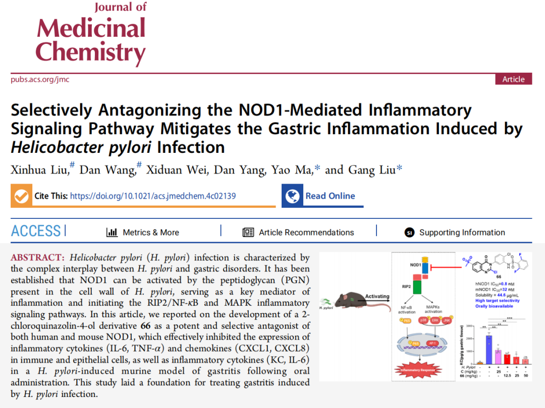 清华大学药学院刘刚课题组报道了一类高效的选择性NOD1拮抗剂用于抑制幽门螺旋杆菌导致的胃炎的研究 2024年12月5日,清华大学药学院刘刚课题组在Journal of Medicinal Chemistry杂志上发表了题为 “Selectively Antagonizing the NOD1-Mediated Inflammatory Signaling Pathway Mitigates the Gastric Inflammation Induced by Helicobacter pylori Infection” 的研究论文