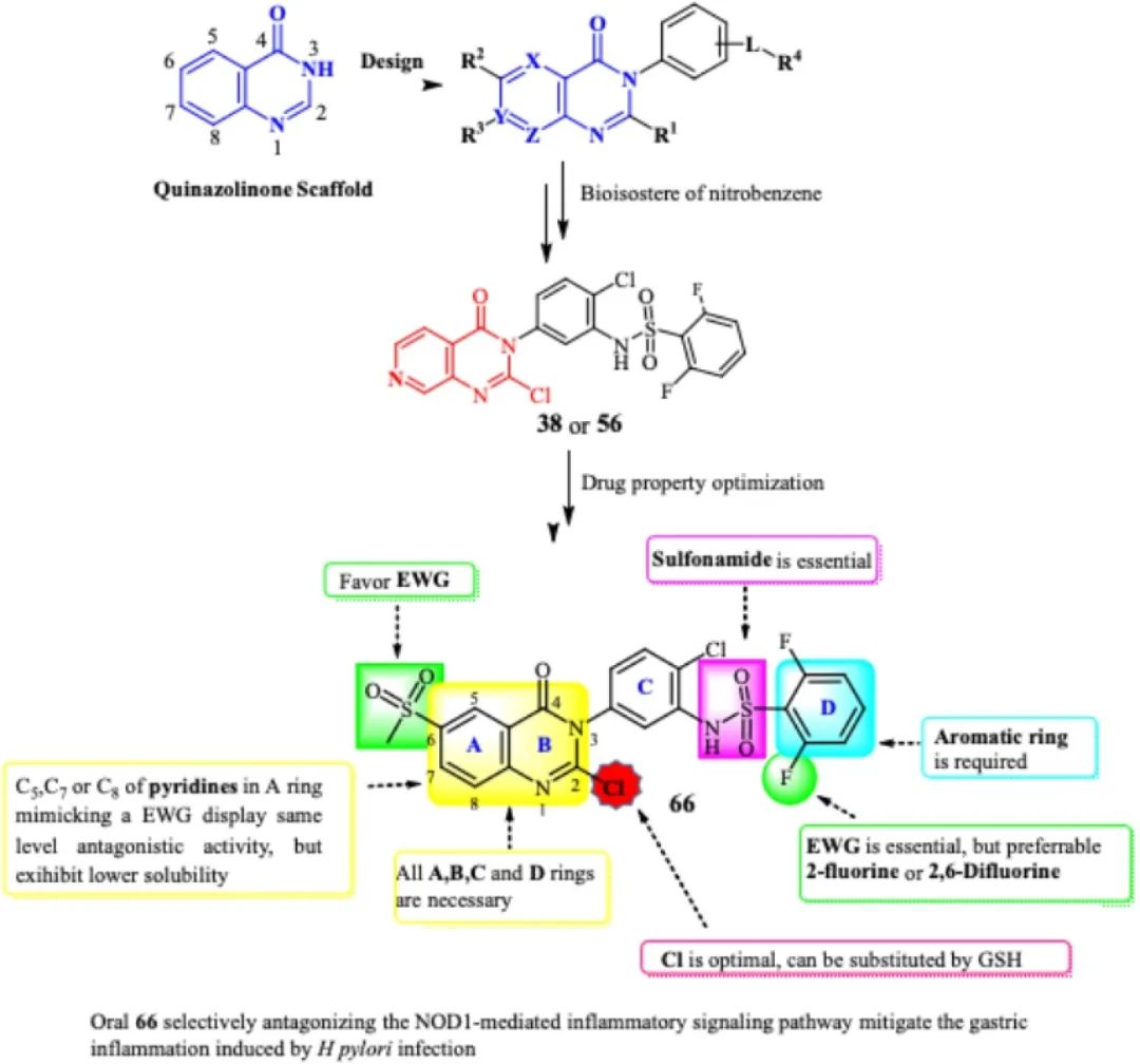 本研究发现了新型、高活性和高选择性的NOD1拮抗剂,化合物66在细胞水平及小鼠体内展现了非常好的口服抗炎药效,同时本研究发现通过选择性拮抗NOD1炎症信号通路可抑制H. pylori感染引起的胃部炎症,为H. pylori感染引起的胃炎的治疗奠定了一定的基础。