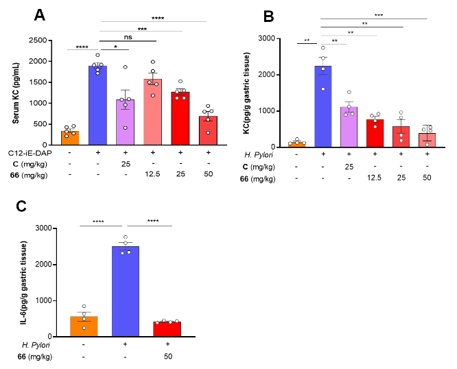 为了评价化合物66体内抗炎效果,我们建立了由 C12-iE-DAP 刺激引起 NOD1信号通路激活的小鼠全身性炎症模型 ,以及由H. pylori感染引起的小鼠胃炎模型。实验结果显示,66通过口服给药可显著抑制小鼠血清KC水平以及胃组织KC、IL-6的分泌(图5)。