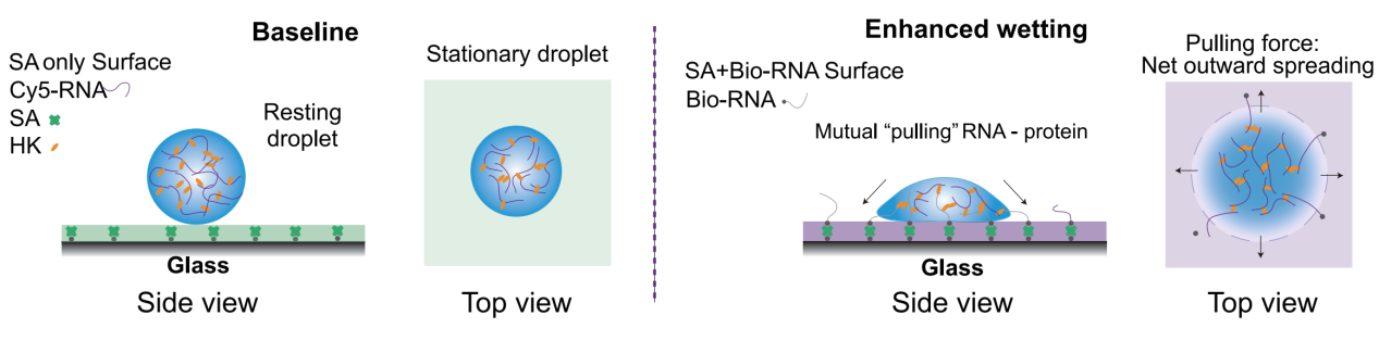 研究者进一步结果表明,HNRNPK 凝聚体与游离的 Xist之间能够产生相互的牵引力并产生润湿现象,在 RNA 的作用下,软化HNRNPK-Xist 共相分离液滴,表现为铺展和扁平化增强的趋势(图2)。这些结果揭示了 HNRNPK 液滴与Xist RNA 之间的相互作用促进了 RNA 以相分离通道的形式进行扩散,并通过增强液滴的形变和润湿行为维持Xist在X染色体扩散的高效性和稳定性。