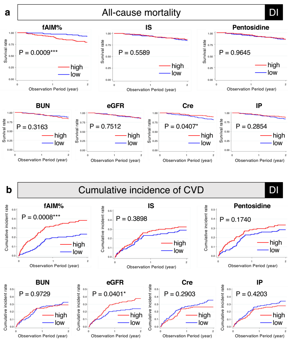 在338例可评估DI患者中,fAIM%高于中位数组的2年全因死亡率显著增加(HR=1.29,P<0.001),心血管事件风险也更高(HR=1.10,P=0.048)。值得注意的是,传统指标如eGFR、肌酐、吲哚硫酸盐(IS)等均未显示预后预测价值。通过5折交叉验证确定fAIM%临界值为46.27%,在验证集中显示良好预测性能(c-index=0.658)。