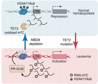 来自Nature的最新研究首次揭示了TET2通过调控RNA m5C(5-甲基胞嘧啶)氧化影响染色质开放状态的全新机制。研究人员发现,在正常造血过程中,TET2通过氧化m5C抑制MBD6(甲基CpG结合蛋白6)的结合,维持组蛋白H2AK119ub的泛素化状态,从而保持染色质的适当紧密结构。然而当TET2发生突变时,MBD6将不受抑制地结合m5C修饰的逆转录转座子RNA,招募BAP1/PR-DUB复合物去除H2AK119ub标记,导致染色质开放和促癌基因的异常表达。