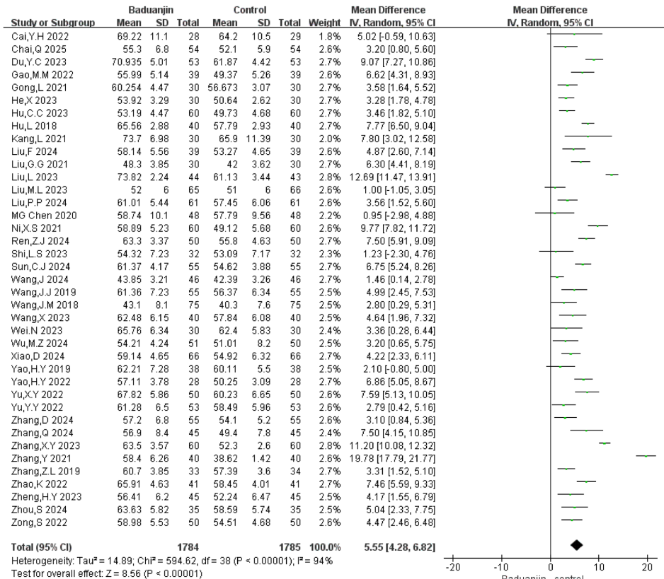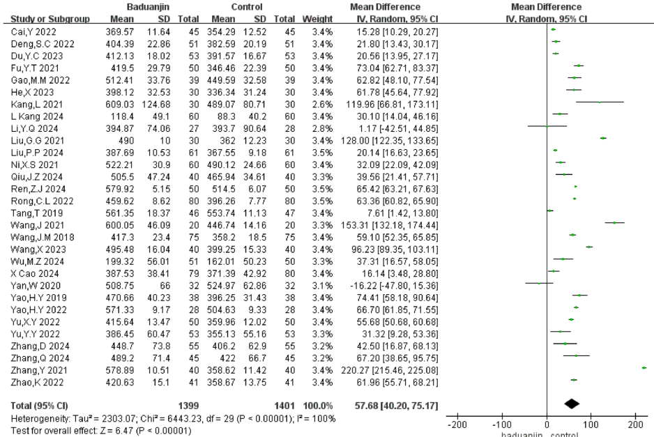 本综述系统评价了56项随机对照试验(共5152例患者),证实八段锦作为经皮冠状动脉介入术(PCI)后心脏康复的有效补充手段,可显著改善左心室射血分数(LVEF)(MD=5.55%, P<0.01)、6分钟步行距离(6MWT)(MD=57.68m, P<0.01)及心肺功能指标(VO2peak、AT、METs),降低主要不良心血管事件(MACE)风险(RR=0.33),并提升生活质量(SAQ量表)及心理状态(SAS/SDS评分)。亚组分析提示慢性冠状动脉综合征(CCS)患者获益更显著,且不建议与有氧运动联用。
