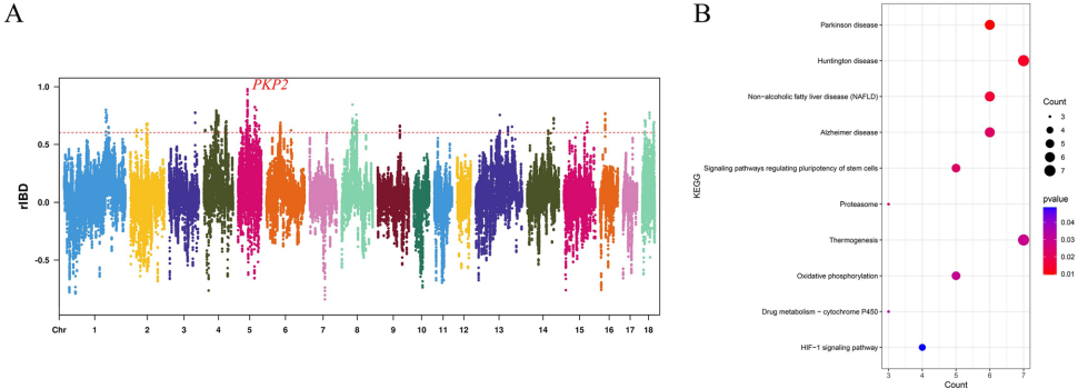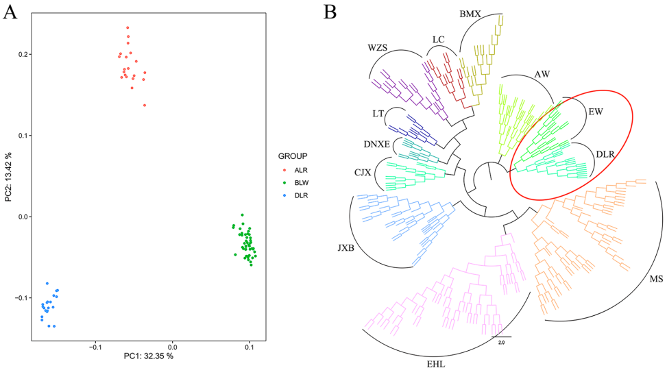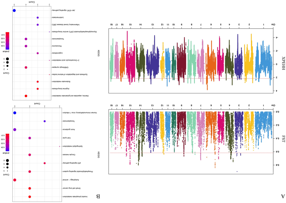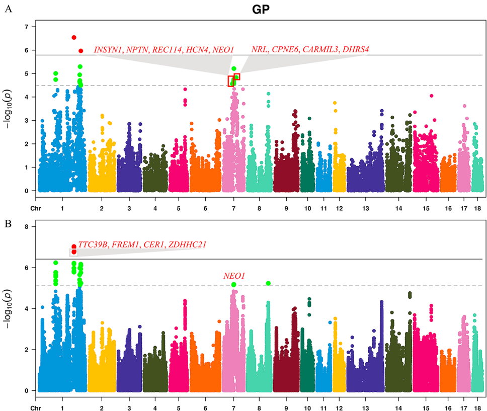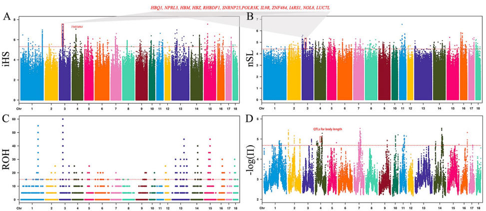 本研究针对丹麦长白猪(DLR)在长期人工选育和血缘混合背景下形成的体长突出、瘦肉率高、繁殖性能强且妊娠期较长等重要经济性状,系统开展了基因渗入、群体选择性清除及全基因组关联分析(GWAS)。研究人员发现英国大白猪(BLW)来源的CREB3L2、PRKAB2等基因通过热生成、氧化磷酸化等通路显著提升瘦肉率;太湖猪(TL)血统渗入(如NDUFS4基因)及HBM、ZNF484等内部选择基因共同贡献了其高繁殖力;妊娠期性状相关基因如INSYN1、NEO1等也被同时鉴定。该研究深化了对DLR猪育种历史的遗传理解,为猪分子育种提供重要靶点与理论依据。
