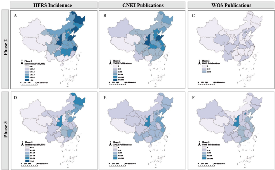 本研究针对中国肾综合征出血热(HFRS)发病率与科研产出不匹配的问题,通过整合CNKI和WOS数据库的3,304篇中文与556篇英文文献,结合1991-2020年全国传染病监测数据,运用地理探测器和斯皮尔曼相关性分析,首次揭示了高发病省份科研产出与疾病分布的强空间相关性(q>0.49),发现东北等高发地区存在显著研究缺口,为优化资源配置和跨区域合作提供了实证依据。
