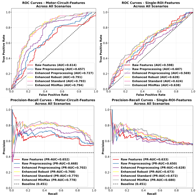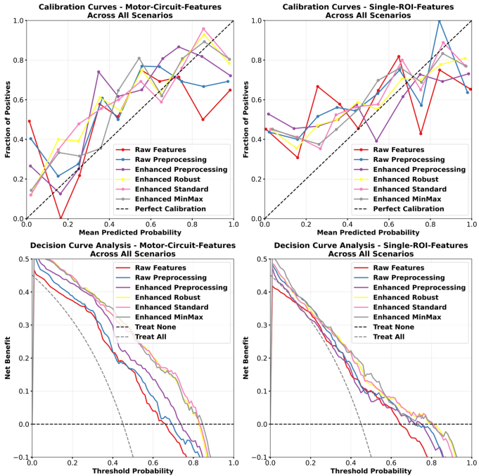本研究针对传统影像组学方法局限于单区域特征提取、难以捕捉复杂疾病病理生理机制中关键区域间关系的问题,开发了一种新颖的跨区域影像组学框架。研究人员通过系统提取解剖和功能连接脑区之间的关系特征,在早期帕金森病(PD)患者中验证了该框架对震颤主导型(TD)和姿势不稳步态困难型(PIGD)亚型分类的优越性。研究结果表明,运动环路特征在曲线下面积(AUC=0.821±0.117)和临床效用方面显著优于传统单区域特征,为理解PD病理机制和推动影像组学在复杂疾病中的应用提供了新范式。