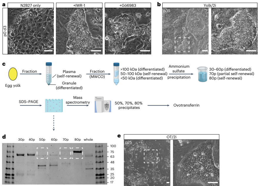 本研究针对禽类缺乏真正种系兼容胚胎干细胞(ES细胞)的技术瓶颈,通过优化培养条件成功建立了鸡及其他七种禽类的ES细胞系。研究人员发现卵转铁蛋白(ovotransferrin)结合Wnt/β-catenin和PKC信号通路抑制剂的OT/2i培养体系可稳定维持鸡ES细胞多能性,进一步通过添加SB431542和鸡白血病抑制因子(chLIF)拓展到其他禽类。研究证实这些ES细胞可高效形成体细胞与种系嵌合体,并能在体外和体内分化为原始生殖细胞(PGCs)。该突破为禽类基因编辑、生物多样性保护及生物技术应用提供了全新平台。论文发表于《Nature Biotechnology》。
