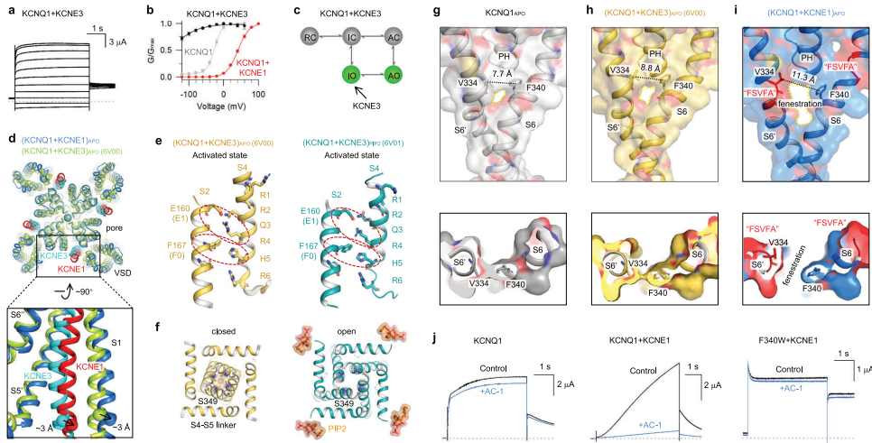 本刊推荐:为解决KCNQ1+KCNE1通道(IKs)结构基础不明的问题,研究人员通过冷冻电镜和电生理技术,解析了其关闭/开放状态高分辨率结构。发现KCNE1诱导KCNQ1发生6处螺旋-环转变,稳定中间态VSD并形成双PIP2调控机制,首次揭示大规模二级结构转变精细调控IKs功能的机理,为长QT综合征靶向治疗提供结构框架。