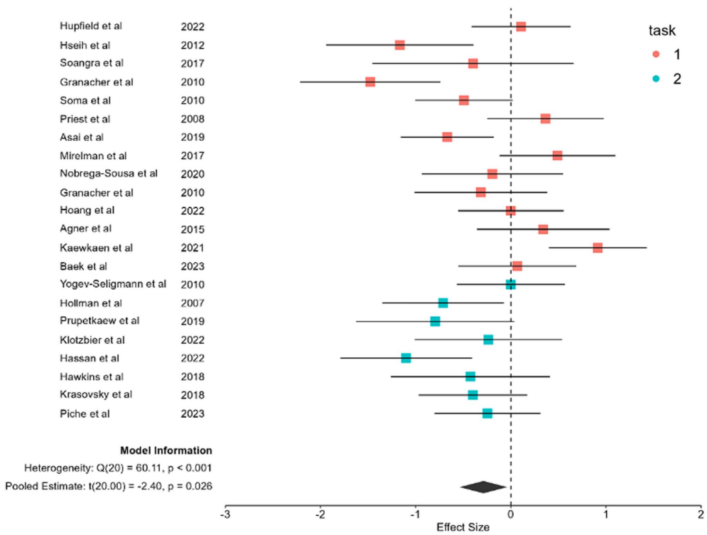 本刊推荐:为明确不同认知任务对双任务行走中步速影响的年龄差异及其神经机制,研究人员开展了针对年轻与老年成年人的meta分析。研究纳入22项研究,发现言语流畅性任务(而非连续减法任务)导致老年组步速下降更显著(Hedges' g = -0.4744),表明前额叶-小脑-基底节环路资源竞争是增龄性认知-运动干扰的核心机制,为针对执行功能的老年运动康复策略提供了理论依据。