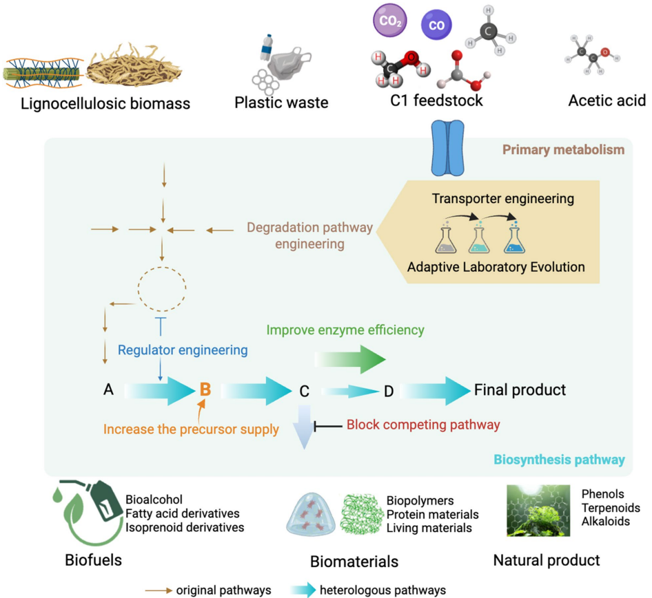 本综述系统阐述了代谢工程与合成生物学在应对环境污染挑战中的前沿应用。文章重点介绍了三类关键技术:用于污染物实时监测的(生物传感器Biosensors)、用于环境修复的(生物修复Bioremediation)及将废弃物转化为高附加值产品的(生物制造Biomanufacturing)。通过工程化微生物实现(C1化合物)(如CO2、CH4)和(木质纤维素生物质Lignocellulosic biomass)的资源化利用,为开发(生物燃料Biofuels)、(生物材料Biomaterials)及(天然产物Natural Products)提供了可持续解决方案。