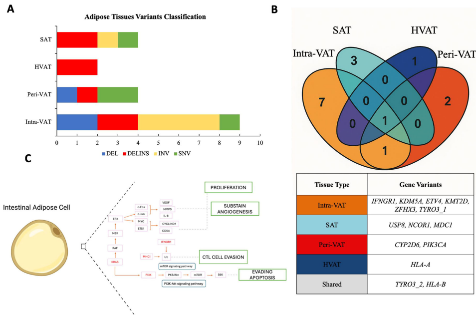 本刊推荐:为解决肥胖相关结直肠癌(CRC)进展及癌症恶病质(CAC)机制不明的问题,研究人员开展了脂肪组织(AT)与CRC分子交互作用研究。通过全基因组测序(WGS)和表观遗传分析,发现近肿瘤脂肪(Intra-VAT)存在代谢重编程(UCP-1+、TMEM26+)、纤维化(TGF-β+、胶原+)和致癌突变(KRAS、HLA、MET)。循环miR-92a与体脂率正相关,与瘦体质量负相关。PON3基因甲基化与营养状况相关,为CRC治疗提供了新靶点和生物标志物。