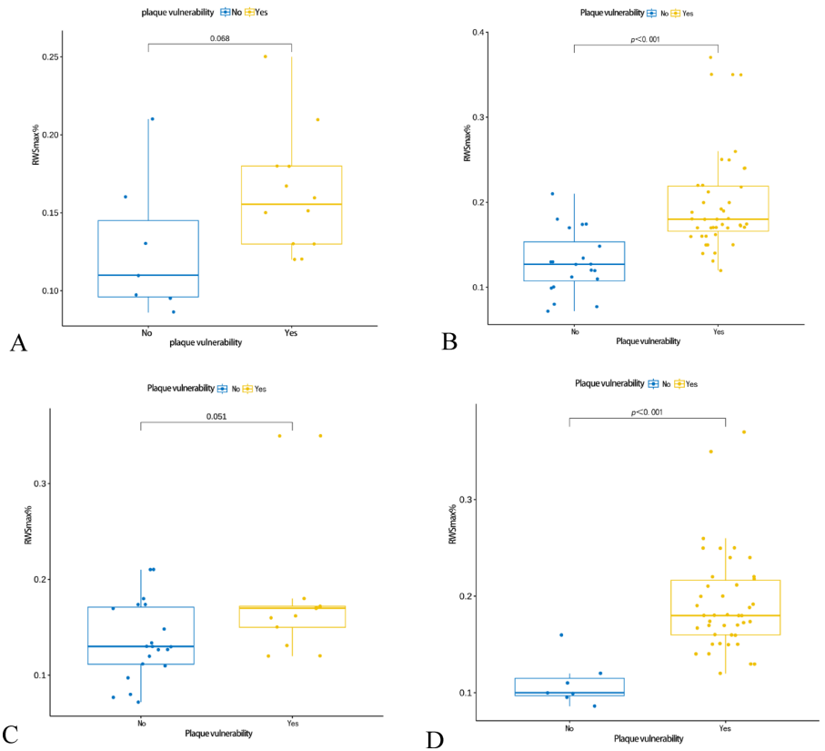 本研究针对颈动脉粥样硬化狭窄(CAS)易损斑块评估的临床难题,利用数字减影血管造影(DSA)衍生的径向壁应变(RWS)技术,结合高分辨率磁共振管壁成像(HR-VWI)验证,首次提出RWSmax≥14.9%可作为斑块易损性的精准判别阈值(AUC=0.838),为卒中风险分层和介入治疗策略优化提供了新型力学评估工具。