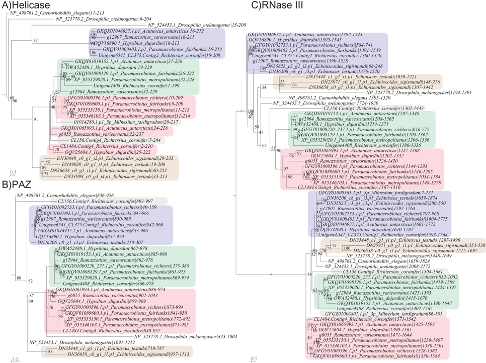 本研究针对缓步动物门中RNA干扰(RNAi)关键蛋白Dicer的进化机制尚未明晰的问题,通过比较基因组学方法对10种缓步动物开展系统研究。研究人员发现缓步动物存在2-4个Dicer基因拷贝,证实其与节肢动物Dicer-2同源的古老重复事件,并揭示多个谱系特异性扩增。该研究通过系统发育分析和蛋白结构预测,证实tDicer基因在解旋酶结构域出现功能分化,为RNAi通路进化提供了重要见解。