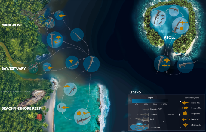 《Reviews in Fish Biology and Fisheries》:Life stage-specific habitat use and trophic ecology of the critically endangered great hammerhead (Sphyrna mokarran)