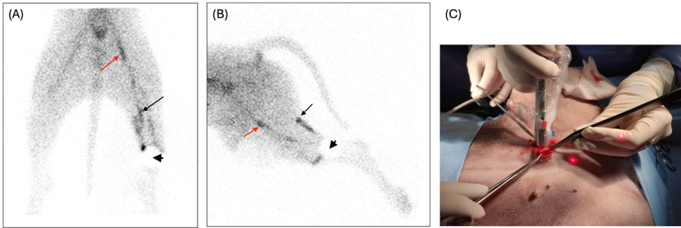 为解决犬猫实体恶性肿瘤前哨淋巴结(SLN)精准定位难题,研究人员开展淋巴显像(LPS)与吲哚菁绿近红外荧光(NIRF-ICG)技术的术中对比研究。结果表明:两种技术对前哨淋巴中心(SLC)的检出率相当(92% vs 93%),但荧光技术能检出更多SLN(P=0.025),且43.5%转移淋巴结仅通过荧光发现。该研究为缺乏核医学设施的动物医院提供了可靠的替代方案,对提升小动物肿瘤精准分期具有重要意义。