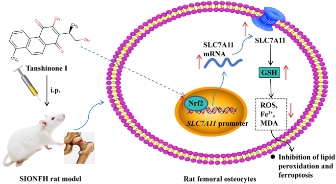 丹参酮I通过激活Nrf2/SLC7A11信号通路,抑制股骨组织细胞的铁死亡,从而减轻类固醇诱导的股骨头坏死(SIONFH)。