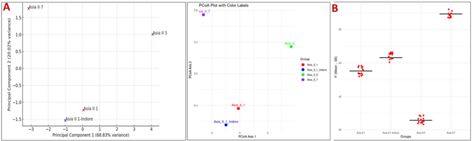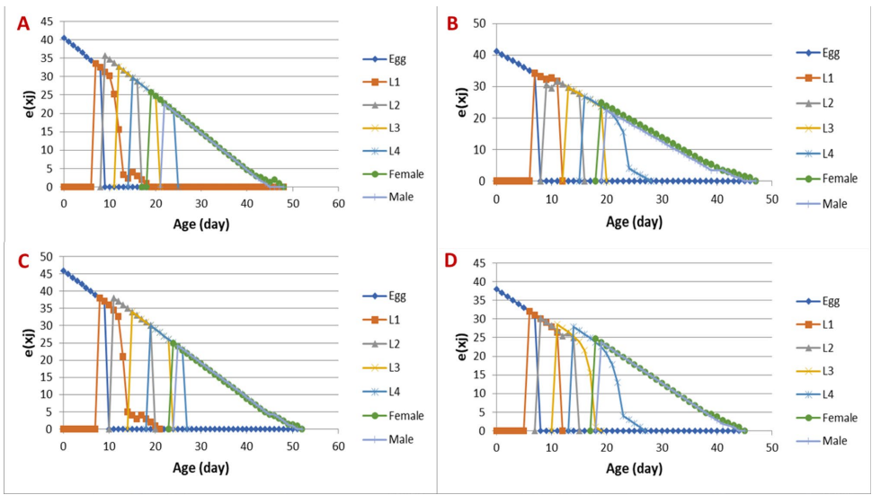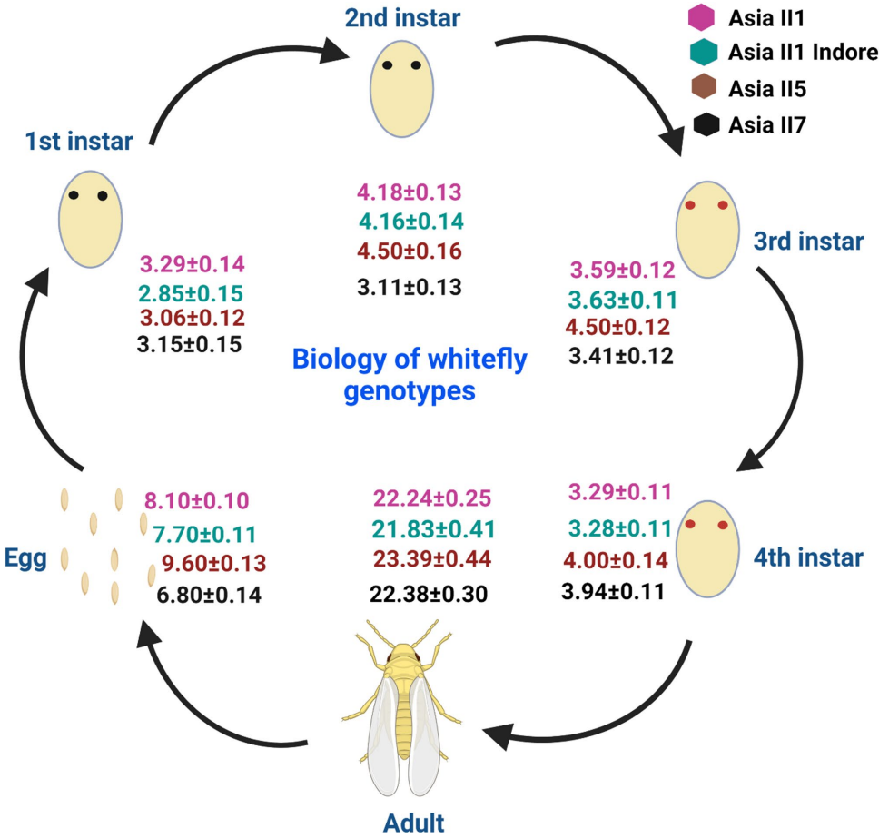 本刊推荐:为解决烟粉虱(Bemisia tabaci)隐存种复合体生物学特性缺乏系统表征的问题,研究人员通过两性生命表(two-sex life table)技术开展了亚洲三大遗传群体(Asia II 1、Asia II 5、Asia II 7)的生活史特征与种群参数比较研究。发现Asia II 7群体具有最短发育周期(20.38±0.32天)、最高繁殖力(52.33±1.26粒/雌)和最大内禀增长率(0.146±0.0),揭示了不同遗传群体在生态适应性上的显著分化,为精准预测种群暴发规律和制定区域化治理策略提供了关键科学依据。