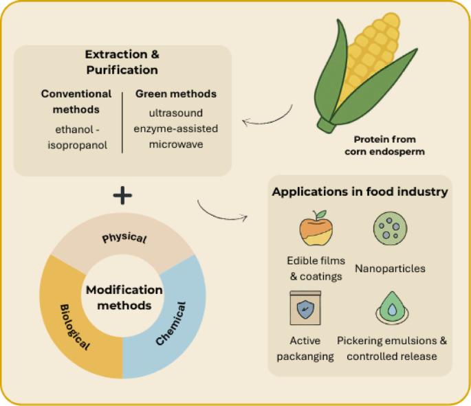 玉米醇溶蛋白(zein)作为可持续生物材料在食品工业中应用广泛,综述了其来源、超声波及酶辅助提取等环保方法,改性后用于智能包装、纳米封装和控释系统,具有抗氧化、抗菌及阻隔特性,但面临规模化、监管及生物降解评估等挑战,未来需关注绿色提取、农业残渣高值化及 techno-economic 评估。