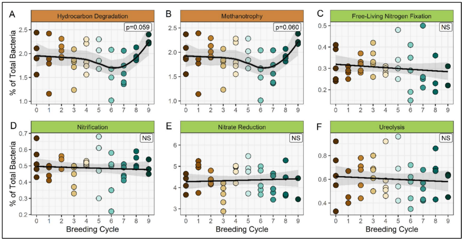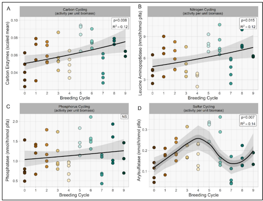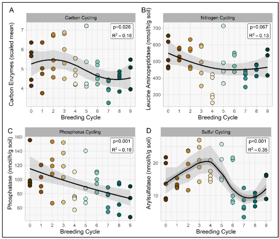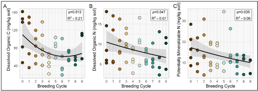 本研究针对植物育种对根际微环境的影响这一关键问题,通过分析从野生型到第9选育周期的Kernza根际土壤,发现选育过程显著降低了活性有机质(DOC、DON、PMN)和微生物生物量(PLFA),但提高了单位微生物的碳氮循环酶活性。结果表明育种塑造了"少而精"的根际微生物群落,为培育具有高效微生物互作能力的作物品种提供了理论依据。