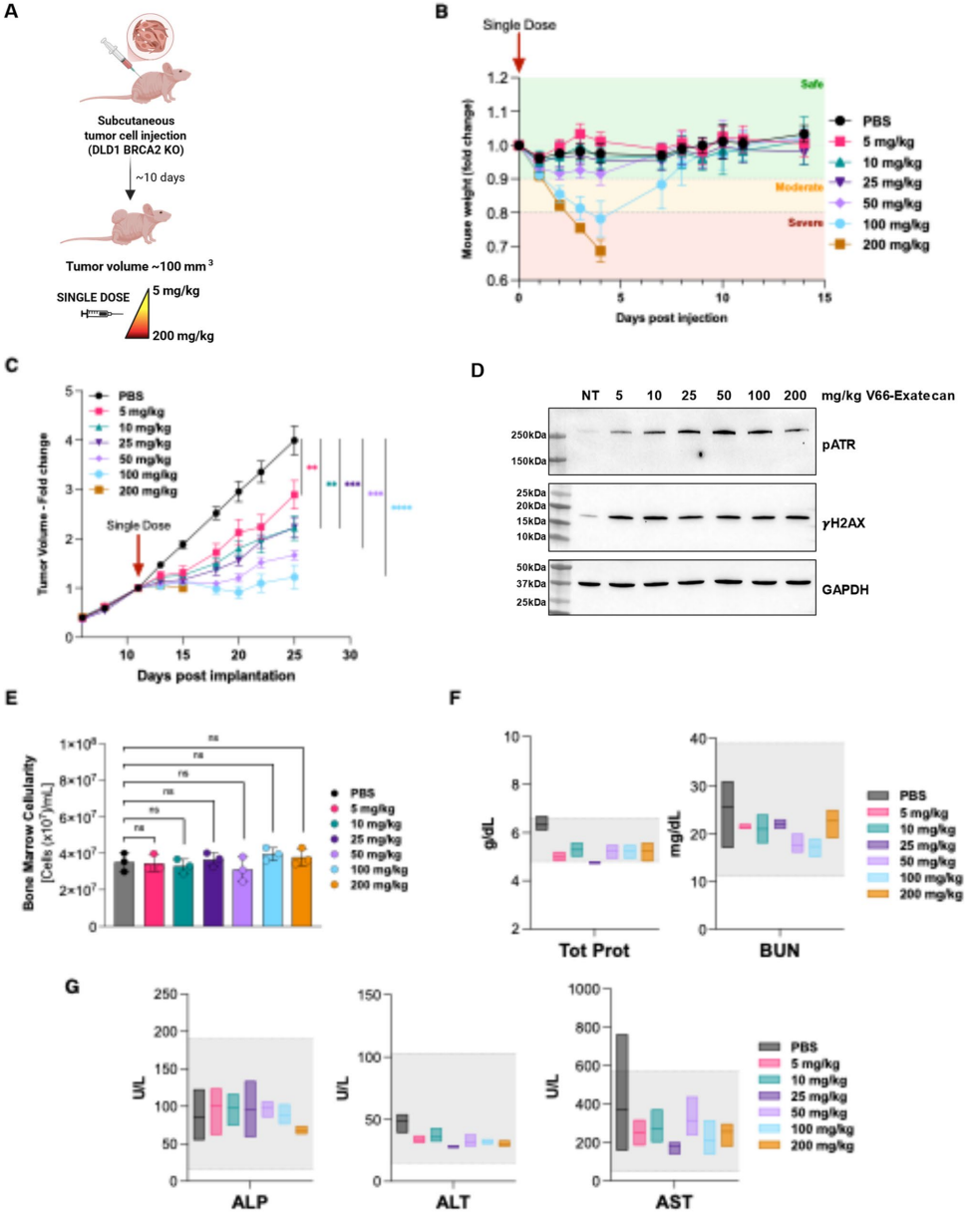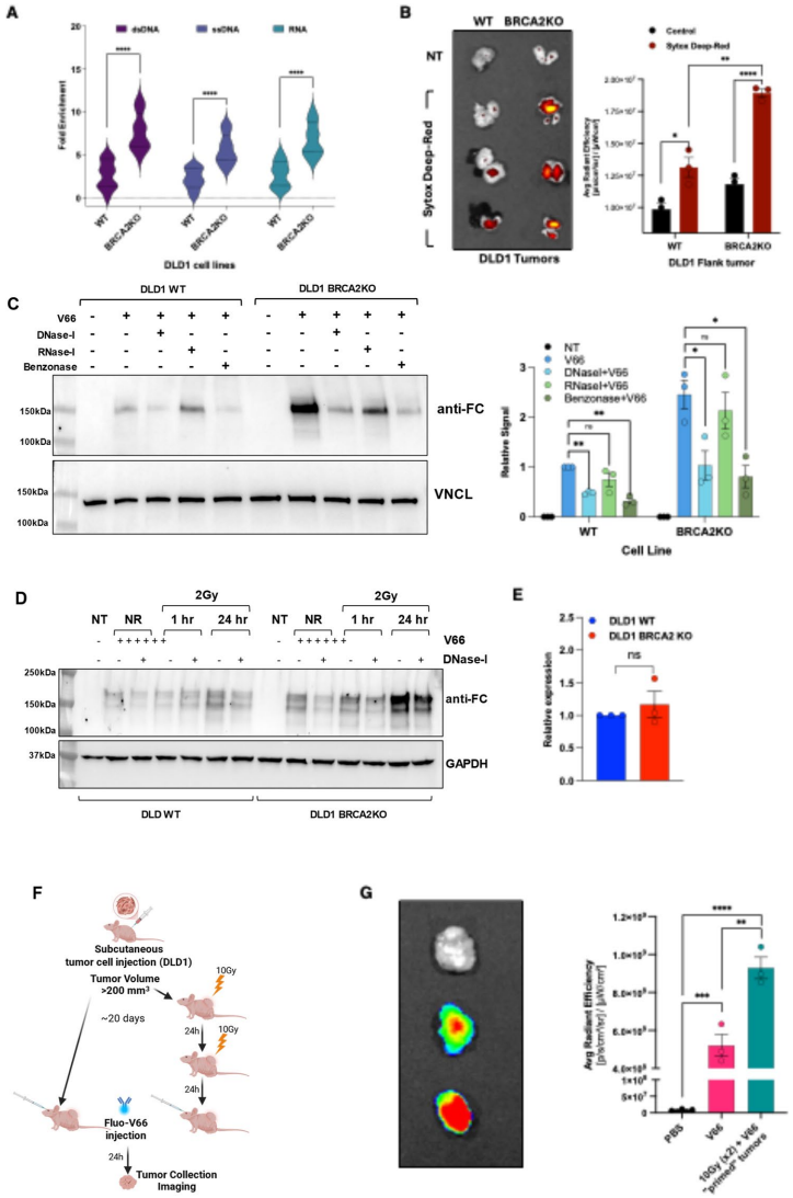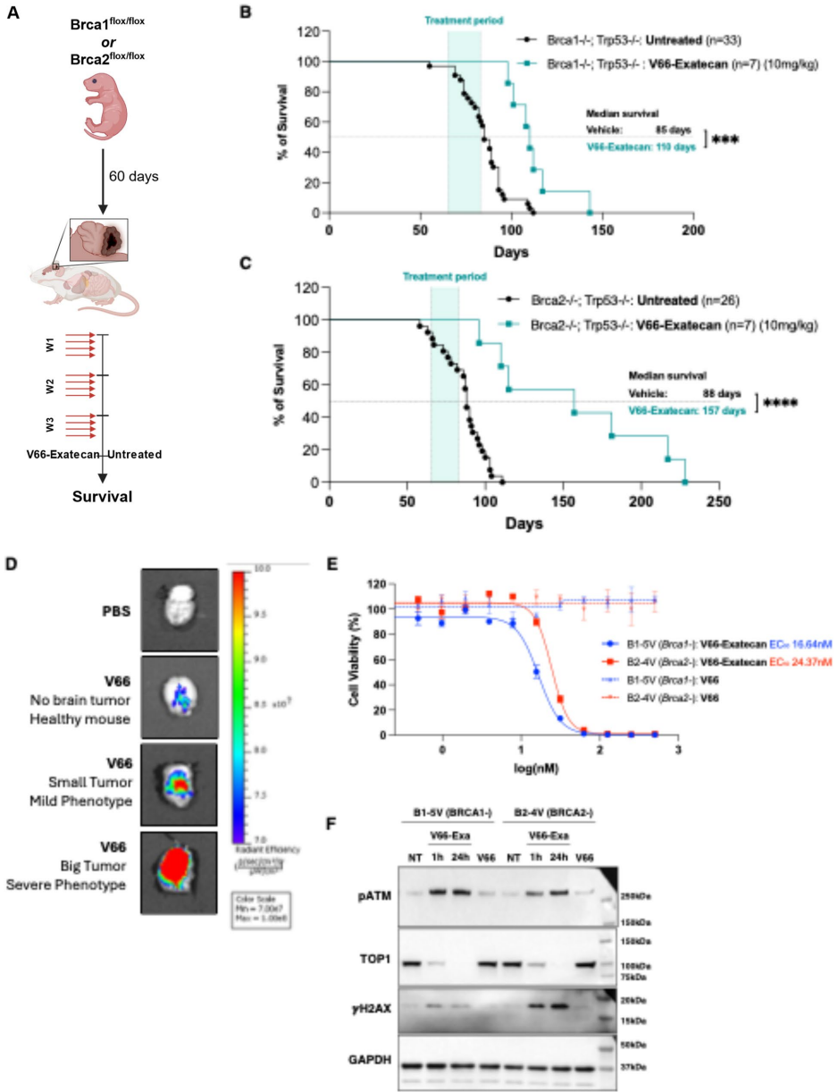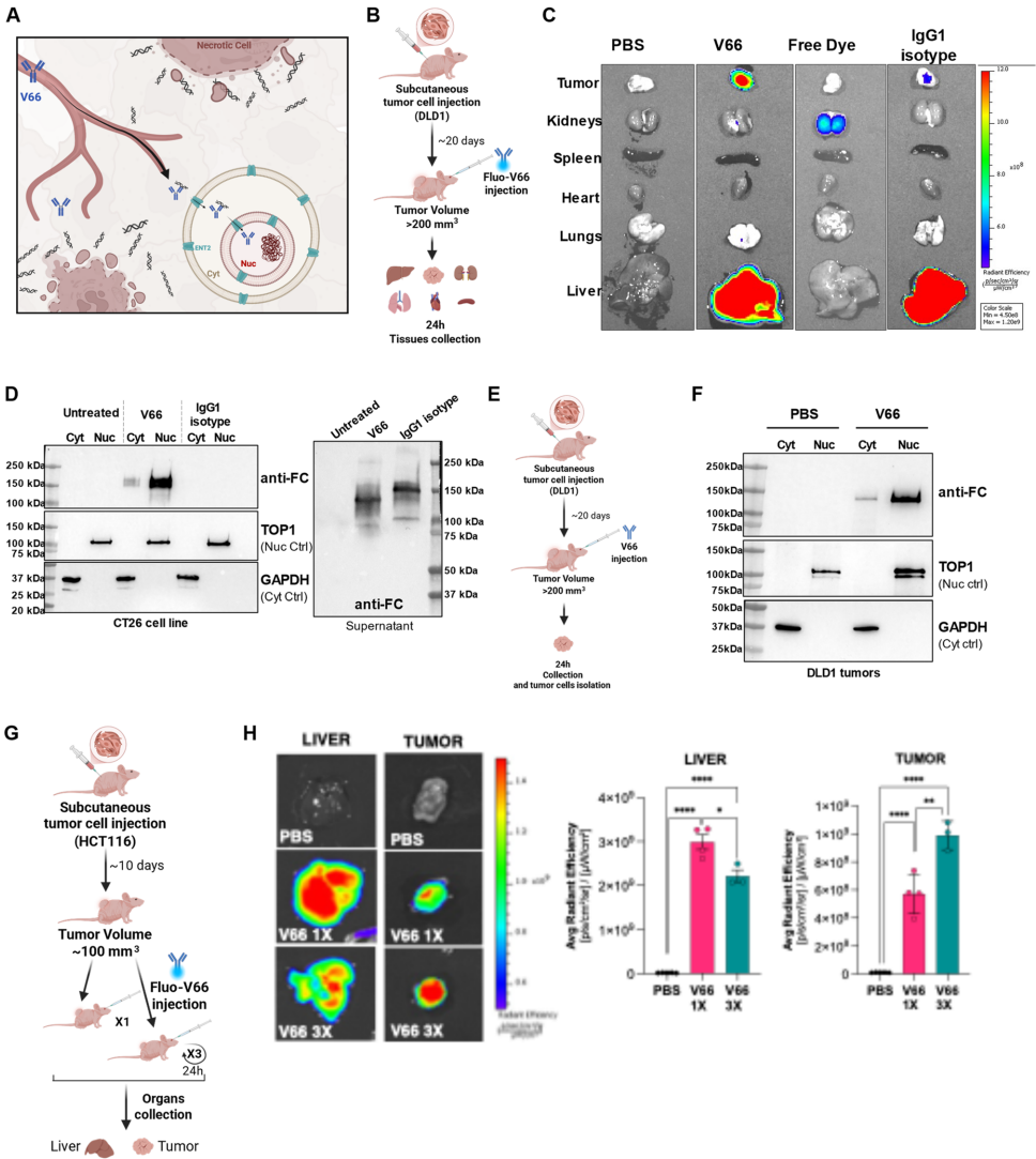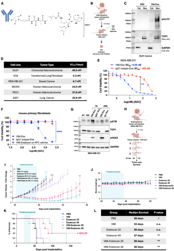 本研究针对当前抗体偶联药物(ADC)面临的肿瘤靶向性不足、内化效率低及难以抵达特殊病灶(如脑肿瘤)等局限,开发了一种基于抗胞外DNA(exDNA)抗体V66的新型ADC——V66-exatecan。该药物通过结合肿瘤微环境中的exDNA和癌细胞高表达的ENT2转运蛋白,实现核内靶向递送exatecan(TOP1抑制剂),在多种癌症模型(包括三阴性乳腺癌和BRCA缺陷型髓母细胞瘤)中诱导显著DNA损伤反应(DDR)、旁观者杀伤及肿瘤完全消退,且无显著毒性。该研究为克服传统ADC局限性提供了新策略,尤其适用于DNA修复缺陷型肿瘤和血脑屏障穿透难题的治疗。