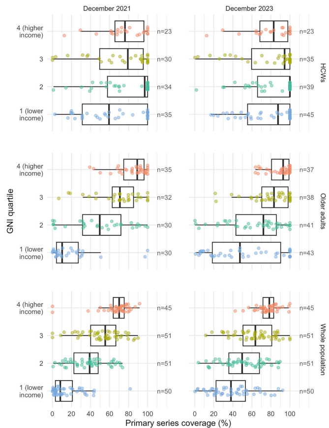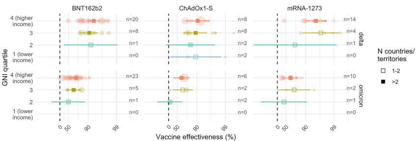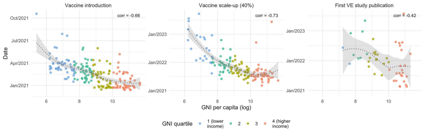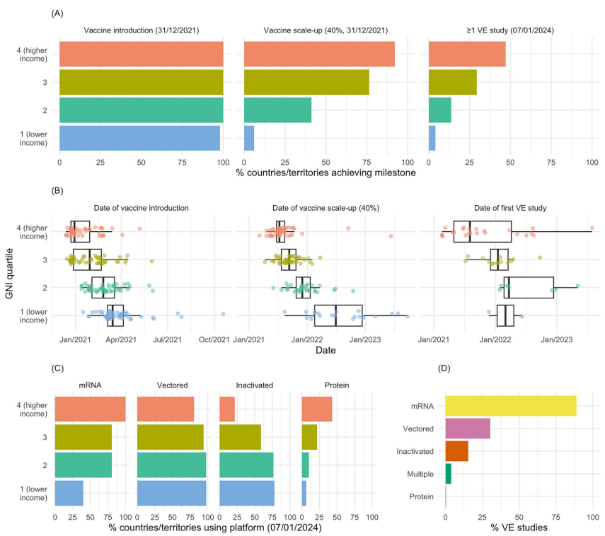 本研究针对COVID-19疫苗在全球范围内实施和评估过程中存在的显著不平等问题,系统量化了不同收入国家在疫苗引入时间、覆盖率里程碑达成及疫苗有效性(VE)研究发表方面的差异。研究人员通过整合世界卫生组织(WHO)和Our World in Data(OWID)等公共数据库,发现低收入国家疫苗引入延迟超过70天,40%基础免疫覆盖率达标时间延长11个月,且VE研究主要由高收入国家和mRNA疫苗主导。Meta回归分析显示BNT162b2、mRNA-1273和ChAdOx1-S疫苗在不同收入国家中对Delta和Omicron变异株所致重症COVID-19的保护效果无显著差异。该研究为未来大流行应对中疫苗公平分配和证据生成提供了关键基准。