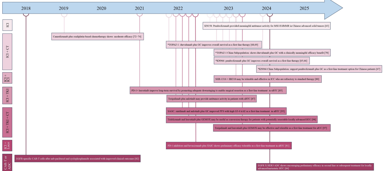 本综述系统阐述了中国晚期胆道癌(BTC)精准医学的最新进展,重点分析了中国患者特有的基因组特征(如TP53、KRAS高频突变)与靶向治疗(FGFR抑制剂、免疫检查点抑制剂联合化疗)的临床实践。文章强调结合人群特异性因素(如乙肝病毒感染、胆道结石高发)制定个体化策略的重要性,为临床医生提供基于肿瘤分子分层的治疗决策参考(ORR、PFS、OS等指标均有详实数据支持),并展望了未来克服耐药性、探索新型联合疗法的方向。