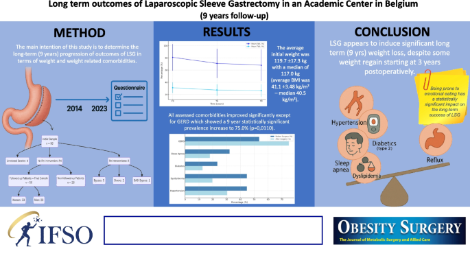 长期随访显示腹腔镜袖状胃切除术(LSG)患者术后3年BMI达最低值28.2 kg/m2,9年体重反弹显著(从31.1%降至26.4%),但代谢综合征相关疾病(高血压、糖尿病等)持续改善,胃食管反流病恶化(p=0.011)。情绪性进食对体重影响显著(p=0.038)。
