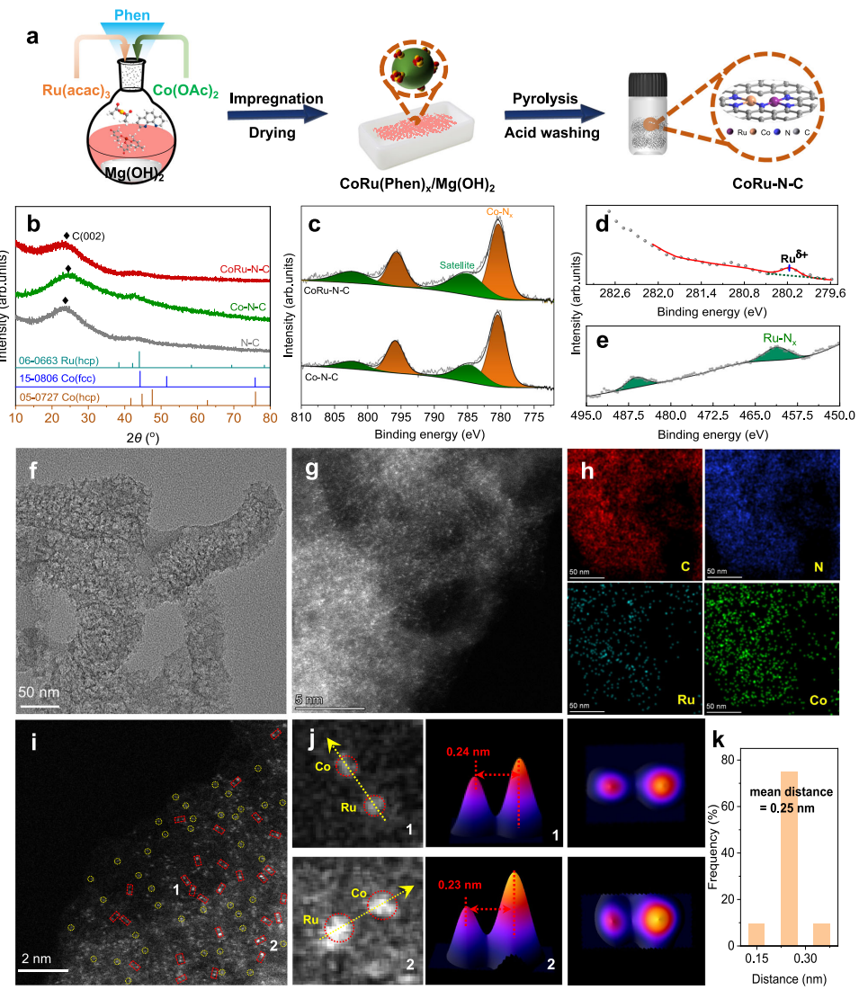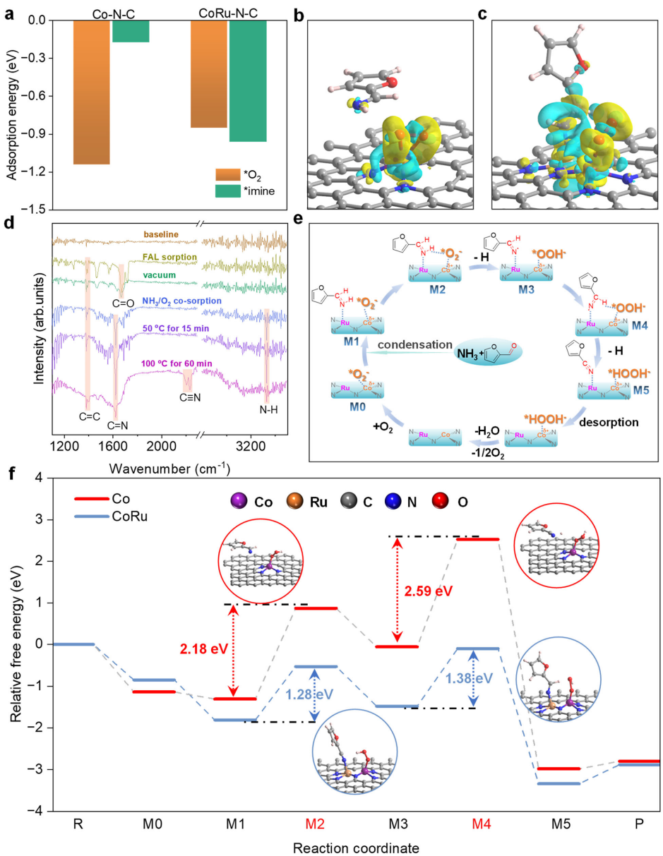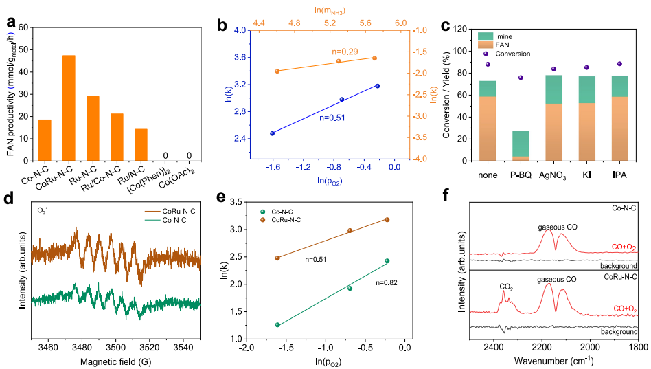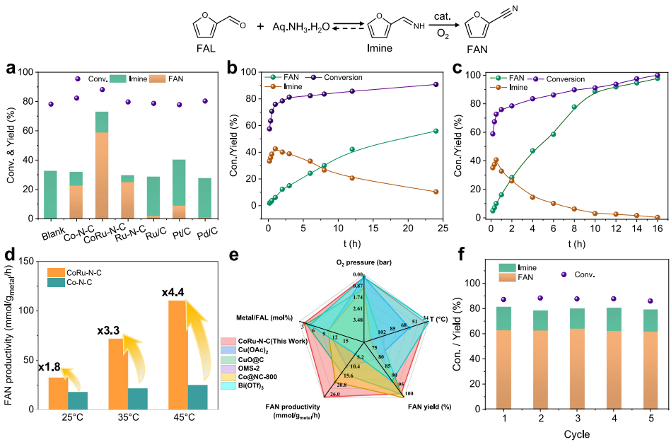 本研究报道了一种单氮桥联Co-Ru双原子催化剂(CoRu-N-C),成功解决了生物质衍生醇/醛氨氧化过程中N物种竞争吸附导致的效率低下问题。通过在氮掺杂碳上构建低配位CoN3和RuN3活性位点,实现了35°C、1bar空气条件下的高效氨氧化反应,2-呋喃腈(FAN)产率达98%,生产率达73mmol/g-metal/h,较单原子Co-N-C提升3.5倍,为温和条件下氨氧化催化剂设计提供了新思路。