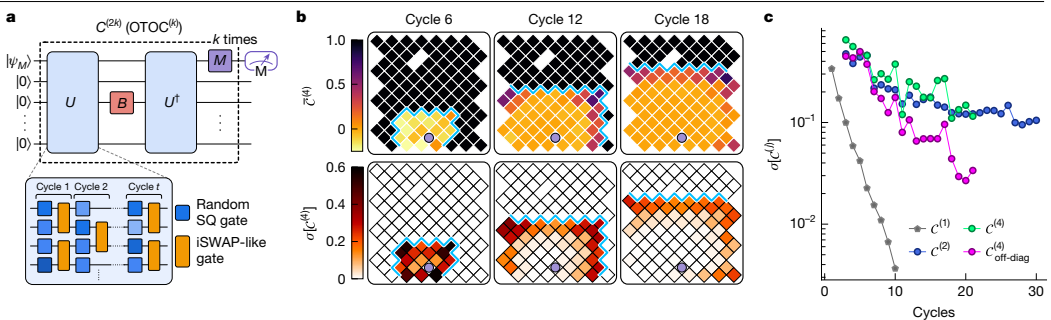 为解决量子多体系统中信息混洗导致的动力学细节丢失问题,Google Quantum AI团队通过超导量子处理器开展高阶OTOC(Out-of-Time-Order Correlator)研究,发现OTOC(2)在长时间尺度下仍保持对动力学细节的敏感性,并揭示Pauli弦间的相长干涉机制。该工作为实现实用量子优势提供了新路径。