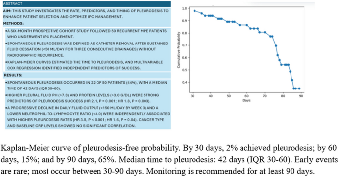 一项为期6个月的前瞻性队列研究跟踪了50名接受IPCs置入的复发性MPE患者。自发性胸膜粘连定义为在连续三次引流后液体量持续减少(<50 mL/天)且无影像学复发情况下拔除导管。研究分析了胸腔积液生化指标、全身炎症标志物及引流模式。使用Kaplan–Meier曲线估计胸膜粘连的发生时间,并通过多变量Cox回归分析确定其独立预测因素。