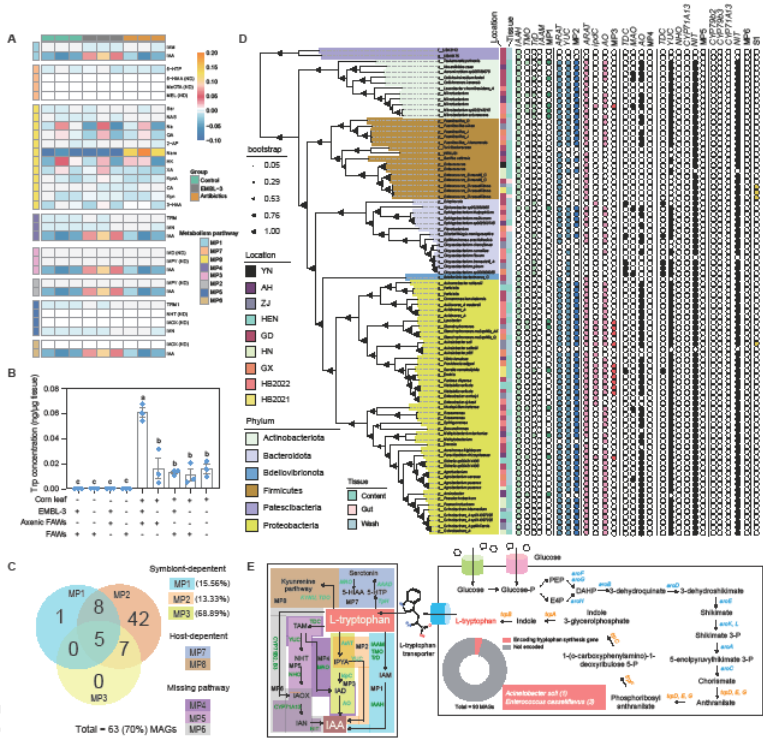 本研究针对草地贪夜蛾(Spodoptera frugiperda)快速进化杀虫剂抗性的难题,创新性地揭示了肠道共生菌Enterococcus casseliflavus EMBL-3通过色氨酸代谢网络增强宿主抗药性的新机制。研究人员发现EMBL-3不仅能直接降解氯虫苯甲酰胺(chlorantraniliprole),更重要的是通过补偿玉米饲料中的色氨酸(tryptophan)缺乏,经微生物群落交叉喂养(cross-feeding)转化为吲哚乙酸(indoleacetic acid, IAA),激活宿主芳香烃受体(aryl hydrocarbon receptor, AhR)通路,上调解毒酶UDP-葡萄糖醛酸转移酶2(UGT2)表达。该研究首次阐明了EMBL-3-IAA-UGT2这一三级共生微生物代谢轴在杀虫剂抗性中的核心作用,为靶向微生物代谢节点的害虫防控新策略提供了理论框架。