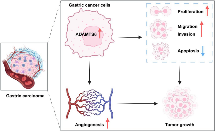 ADAMTS6促进胃癌中血管生成和肿瘤生长的机制图。