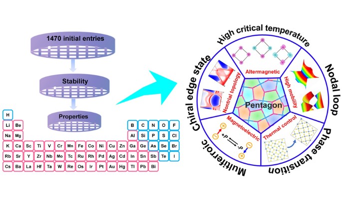 对具有室温反铁磁性、多铁性和拓扑态的二维五角形材料进行计算筛选
