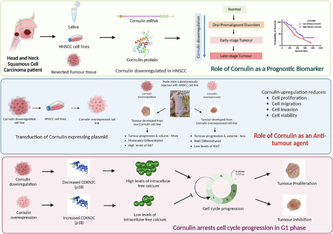 研究发现,Cornulin在唾液和肿瘤组织中的表达均显著下调,且这种下调与肿瘤分化不良及患者生存率降低相关。在过表达Cornulin的HNSCC细胞系中,细胞的增殖、迁移、存活能力和侵袭性均有所下降,这一现象在体内模型中也得到了验证,表明Cornulin具有抗肿瘤作用。我们通过上调p18基因并降低细胞内游离钙离子浓度,揭示了Cornulin的抗肿瘤机制(即通过抑制细胞周期G1期的进程实现抗肿瘤效果)。