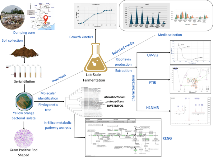 从天然来源可持续且低成本地生物合成核黄素等有价值的营养保健品对研究人员来说是一个重大挑战。能够在不改变基因组成的情况下过量生产核黄素的细菌菌株非常罕见。本研究首次报道了一种新分离出的革兰氏阳性、杆状的本土细菌单培养物——Microbacterium proteolyticum(GenBank 登录号:PQ517523),它被证明是一种有前景的核黄素生产菌。生长动力学研究表明,在 Luria Bertini 培养基中,该菌在生长 6–8 小时时达到最佳生长状态,最大特定生长速率为 0.887 h?1。核黄素的产量为 459.31 ± 22.79 mg/L,相当于每克细菌生物量产生约 49.79 ± 1.29 mg 的核黄素。利用 Luedeking-Piret 模型进行的生产动力学分析显示,该菌的生产过程同时具有与生长相关的(α = 0.244)和非生长相关的(β = 0.16)特征,并且产率系数高达 0.304。通过 KEGG 和 MetaCyc 数据库对属于 Microbacterium 属的 45 个物种的核黄素生产能力进行了计算机模拟验证,结果表明核黄素的合成涉及 rib 操作子。通过对 BioCyc 数据库的分析,预测了迄今为止全球范围内关于 Microbacterium sp 的相关研究报道数量及其分布区域和环境生态位。通过紫外-可见光谱、傅里叶变换红外光谱和核磁共振对粗核黄素进行提取和表征,进一步确认了这种有色物质的化学性质为核黄素。这项研究发现了一种新的细菌菌株,它具有成为核黄素生产菌的潜力,对制药、食品和化妆品行业具有重要的未来应用价值。