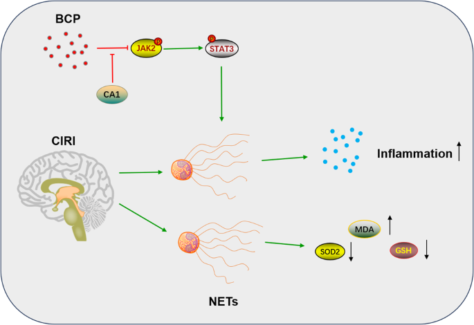脑缺血再灌注损伤(CIRI)中β-卡aryophyllene(BCP)通过抑制NETs形成、降低炎症和氧化应激水平,并调节JAK2/STAT3信号通路改善神经功能及认知恢复。摘要结束分隔符