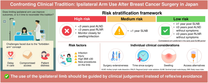 在乳腺癌手术后,许多国家一直存在禁止使用同侧手臂进行静脉输液、抽血或测量血压的惯例,这种做法在一些日本医疗机构中仍然很普遍,这通常是基于常规的标识说明和过于简化的教育措施。虽然在哈尔斯特德(Halsted)提倡的根治性乳房切除术时代,由于术后淋巴水肿的发生率较高,这种做法在历史上是合理的,但如今随着保乳手术和前哨淋巴结活检(SLNB)的广泛应用,临床上明显的手臂肿胀情况已经显著减少。最近的大规模回顾性研究以及相关学会声明(包括日间麻醉学会、美国乳腺外科医师学会以及澳大利亚和新西兰麻醉师学院)都支持基于风险的个性化评估,而非一概禁止。本文探讨了导致这些过时限制存在的文化、教育及系统性因素,并提出了一种以症状为导向的风险分层框架。在前哨淋巴结活检后1年或腋窝淋巴结清扫/区域淋巴结放疗后3年无症状的患者,发生与输液相关的并发症的风险较低。文章还分析了严格政策的不良后果,如影响输液便利性、延误治疗以及增加患者痛苦,并提出了机构层面政策调整和患者教育的策略。从全面禁止转向个性化管理,有助于使临床实践与现代医学证据保持一致,促进患者自主权,并防止过时规范的延续。