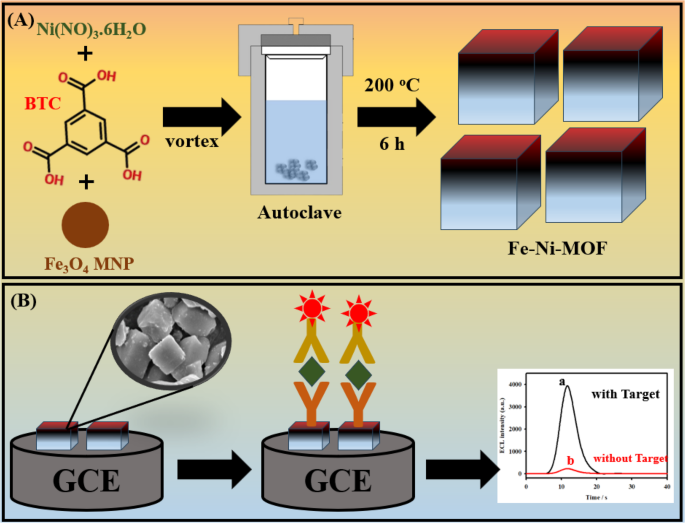 本研究开发了一种高灵敏度、高选择性的电化学发光(ECL)夹心型免疫传感器,用于检测甲胎蛋白(AFP),这是一种对早期肝癌诊断至关重要的生物标志物。该传感器平台将基于Fe-Ni的金属有机框架(MOF)与磁性Fe?O?纳米颗粒(Fe-Ni-MOF)结合,并用一级抗体(Ab1)进行功能化。碳量子点(CQDs)与二级抗体(Ab2)结合,作为ECL发光体。该免疫传感器对AFP的检测范围为0.001至1000 ng/mL,检测限低至0.0084 ng/mL。结构、形态、热学和光学表征证实了复合材料的成功合成和功能化。此外,所制备的传感器表现出优异的重现性、特异性和稳定性,表明其作为复杂生物样本中早期癌症诊断实用工具的潜力。