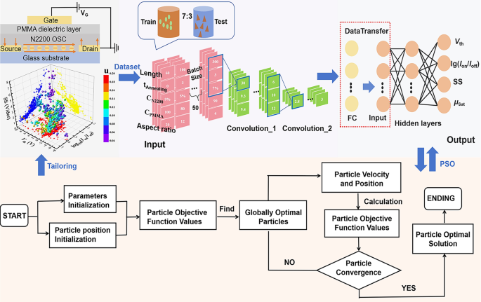 本研究通过优化N2200基OFETs的沟道长度(150μm)、N2200/PMMA浓度比(7/100 mg/mL)及退火条件(80℃×3h),显著提升器件性能。基于719组实验数据,创新性构建CNN-PSO-BP混合模型,自主提取物理特征,实现Vth、SS等参数R2>0.9,误差较传统模型降低10%-15%,为智能器件预测提供新范式。