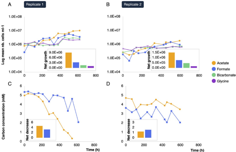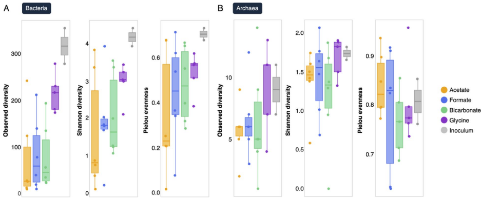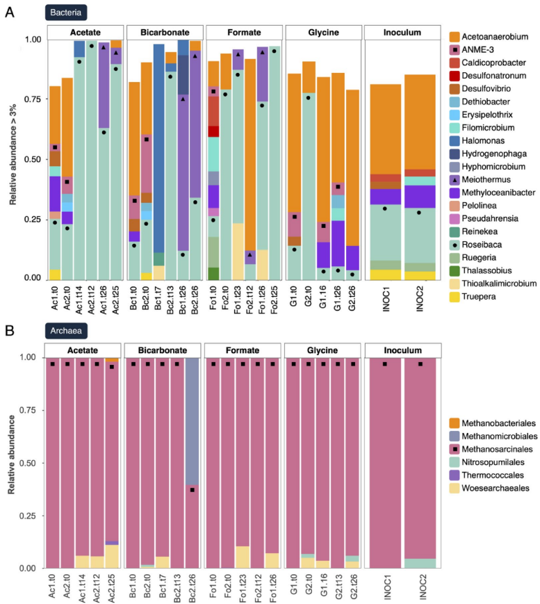本研究针对蛇纹岩化热液系统(如Prony湾)中溶解无机碳(DIC)匮乏制约微生物初级生产的难题,通过构建H2供给的厌氧生物反应器,以碳酸氢盐(bicarbonate)、甲酸盐(formate)、乙酸盐(acetate)和甘氨酸(glycine)为单一碳源,富集培养原位微生物群落。结果表明,除甘氨酸外,其余碳源均能驱动特定类群(如Roseibaca、Meiothermus)的显著富集,并揭示其通过自养-异养协同的"基石物种"互作网络(如CO2/CH4循环)维持生态系统功能,为理解极端碱性环境中生命策略的适应性进化提供了实验证据。