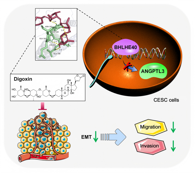 BHLHE40/ANGPTL3在宫颈上皮癌(CESC)中的作用示意图:BHLHE40通过ANGPTL3促进CESC的上皮-间质转化,而地高辛通过特异性结合BHLHE40来阻断这一过程。