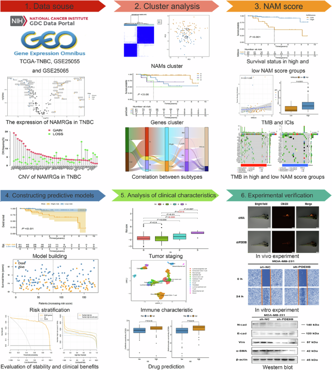 本研究揭示核苷酸代谢相关基因(NAMRGs)在TNBC中影响分子亚型、临床病理特征及预后,构建NAM_model预测模型,发现PDE8B促进EMT和转移,并关联化疗靶向敏感性及TME免疫耗竭。