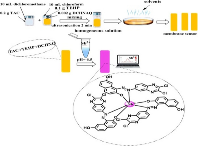 展示了传感器制备过程以及形成的Sb-DCHNAQ3复合物的配位示意图。