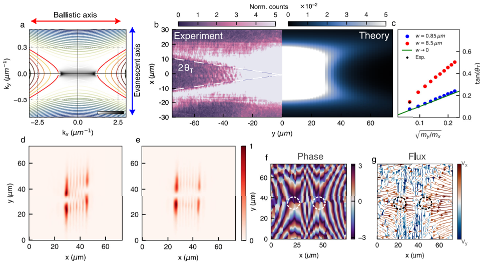 本刊推荐:研究人员针对耦合量子系统中耦合机制调控难题,在双曲色散的光子晶体波导中构建了全光可调谐的激子极化激元(Exciton-Polariton, BiC)凝聚体二聚体。通过改变二聚体相对于光栅的角度,首次实现了从倏逝耦合到弹道耦合的连续调控,直接观测到由鞍形色散形成的光谱特征和质量流。该工作为研究延迟耦合非线性振荡器与紧束缚物理界面现象提供了新平台。