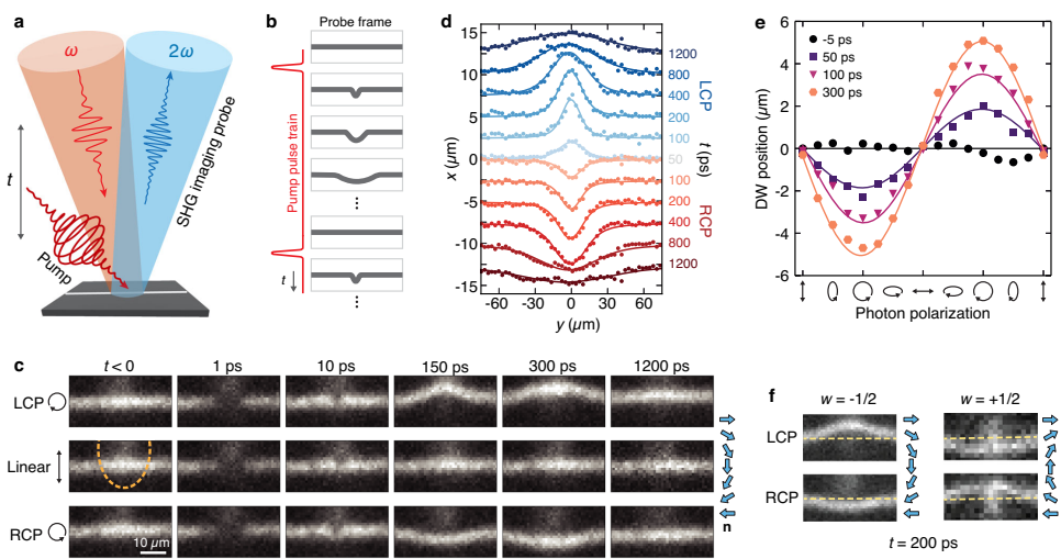 超快激光脉冲通过激发相干自旋波(面内模式)引起奈尔矢量的局部旋转。圆偏振光沿±z方向注入自旋角动量,使CuI亚晶格磁矩朝向±z方向倾斜,通过交换相互作用产生奈尔矢量的面内旋转。泵浦光螺旋性因此设定了奈尔矢量的初始旋转方向,进而决定了畴壁的初始运动方向。
