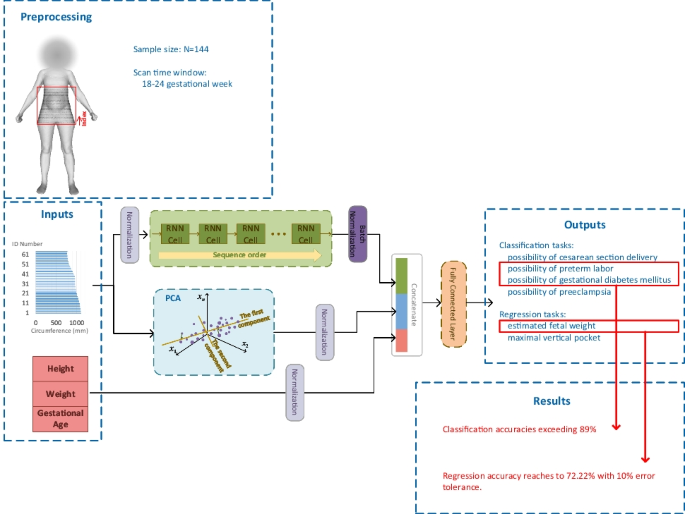 孕妇18-24周三维体型扫描数据用于开发双流算法模型,结合监督学习提取腹部circumference序列特征和无监督学习提取全身shape描述,并与人口学数据融合。结果显示该模型在预测早产(89.6%)、妊娠糖尿病(91.2%)和胎儿体重估算(72.22%误差率内)方面优于传统方法,准确率提升18.18%。