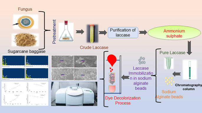 来自纺织和染料制造行业的含染料工业废水的排放对环境和健康构成了严重威胁,因为合成染料(尤其是偶氮化合物)具有持久性和毒性。传统的处理方法往往无法完全去除染料,还可能产生二次污染物。我们开发了一种绿色生物催化方法,使用固定在海藻酸钠珠子中的漆酶来高效去除染料。在这项研究中,我们筛选了一种来源于土壤的真菌菌株(A19),鉴定为烟曲霉,并以甘蔗渣作为生长底物进行淹没发酵。原始酶的比活性为1.122 mg/mL,通过硫酸铵沉淀和Sephadex G-100层析纯化后,纯度提高了1.92倍,回收率为75.57%。SDS-PAGE分析显示漆酶的分子量约为69 kDa。将纯化的酶固定在海藻酸钠珠子上后,120小时内可去除88.33%的刚果红和80.15%的溴酚蓝。这两种染料的吸附遵循朗缪尔等温模型,表明其以单层形式结合,最大吸附容量分别为刚果红0.09 mg/g和溴酚蓝1.16 mg/g。将漆酶固定在海藻酸钠珠子上提高了其稳定性和可重复使用性。FTIR分析证实了处理后的官能团变化,SEM–EDX数据揭示了染料处理后珠子的元素组成变化。本研究展示了一种利用固定在海藻酸盐珠子中的漆酶进行合成染料去除的绿色、经济高效的生物催化系统。结果突显了该酶的稳定性、高效性以及在大规模工业废水处理中的潜力。