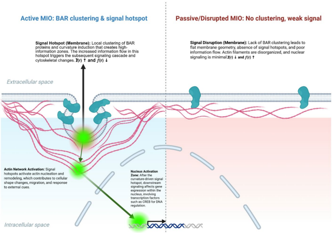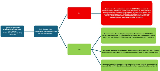本研究针对生物膜在信号转导中的主动作用未被系统量化的问题,提出了膜信息组织(Membrane Information Organization, MIO)框架。研究人员通过整合Helfrich弯曲能量与Shannon互信息,定义了膜力学-信息对齐指数A=corr(?(r),-f(r)),揭示了纳米结构域(如脂筏、BAR蛋白支架)通过调控EGFR/HER2纳米簇形成等机制优化信号保真度的规律。该研究为癌症、神经退行性疾病等膜组织紊乱相关病理提供了可量化的诊断指标,并指导了脂质纳米颗粒(LNP)递送系统的优化,发表于《Discover Life》,对基础生物学与转化医学具有里程碑意义。