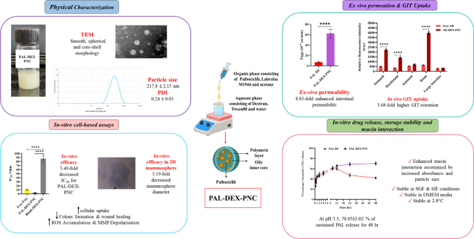 乳腺癌(BC)仍然是一个重大的全球健康问题,其中三阴性乳腺癌是最具侵袭性的类型之一。帕博西利布(Palbociclib,简称PAL)在乳腺癌治疗中显示出良好的效果,但其溶解度较低、口服生物利用度较差,且全身吸收效果不稳定。为此,研究人员开发了一种基于载有帕博西利布的右旋糖酐(PAL-DEX-PNC)的聚合物纳米胶囊,以提升其溶解度、稳定性、在胃肠道(GIT)中的滞留能力以及抗癌效果。优化后的PAL-DEX-PNC颗粒尺寸为217.8 ± 2.15纳米,粒径分布指数(PDI)为0.24 ± 0.03,Zeta电位为1.72 ± 1.07毫伏,药物包封效率为99.71 ± 3.1%。在2–8°C的温度下,PAL-DEX-PNC在模拟的胃肠道环境和DMEM细胞培养基中可保持60天的稳定性。在pH 5.5和7.4条件下,PAL-DEX-PNC的释放率分别为70.05 ± 3.02%和62.46 ± 3.43%,并且这种释放效果可持续48小时。体外渗透性研究表明,与游离帕博西利布相比,PAL-DEX-PNC的药物渗透性提高了8.85倍。体外细胞毒性实验发现,PAL-DEX-PNC的细胞毒性显著更强,IC50值降低了3.49倍,凋亡指数提高了2.22倍。此外,实验还观察到PAL-DEX-PNC能够增加活性氧(ROS)的产生、诱导基质金属蛋白酶(MMP)的去极化、增强细胞摄取,并抑制细胞团的形成和伤口愈合。另外,使用PAL-DEX-PNC处理后,3D乳腺球囊的直径减少了3.19倍。体内胃肠道摄取实验表明,载有尼罗红(Nile red)的聚合物纳米胶囊在胃肠道中的荧光强度比游离尼罗红高3.68倍,这归因于右旋糖酐(DEX)的黏附特性。
